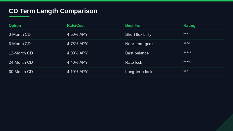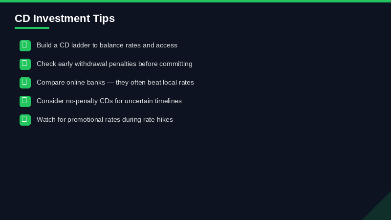 Don't need the full 5-year structure? A mini ladder using 3-month, 6-month, 9-month, and 12-month CDs gives you quarterly access to a portion of your cash while still capturing short-term high rates.