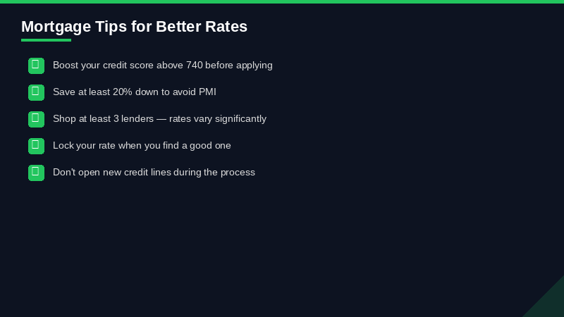 Not every lender advertises the full picture. Watch for: - Teaser rates that assume points purchased (1 'point' = 1% of loan amount = rate reduction of roughly 0.25%. A 5.75% rate might require paying 2 points to get there) - Rates quoted without property taxes/insurance ('payment' quotes that look low) - Introductory ARM rates presented without the adjustment risk - 'Rate' vs APR confusion — always compare APR to APR