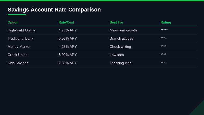 — *Kids' savings accounts*: Usually joint accounts or custodial accounts (UGMA/UTMA) opened by parents. Some banks offer dedicated kids accounts with modest rates and educational tools. Rates are often mediocre.
