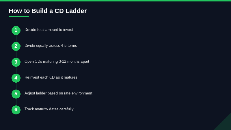 Don't need the full 5-year structure? A mini ladder using 3-month, 6-month, 9-month, and 12-month CDs gives you quarterly access to a portion of your cash while still capturing short-term high rates.